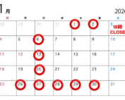 ⭕印が休業日です。 1月は下旬に冬季休業がありますので、ご予約等は早めをお勧めしております。