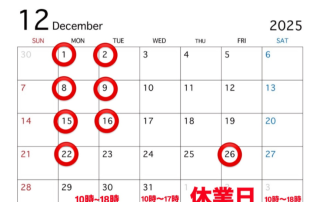 🎄12月のお知らせ🎄 🎄12月のお知らせ🎄 ⭕印が休業日です。12月は不定休となっております。また年末年始は営業時間が短縮になりますのでお時間に余裕を持ってご来店ください。 md_user2025-11-30T17:17:26+09:002025/11/30|お知らせ|