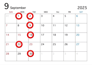 9月のお知らせ md_user2025-09-07T08:02:59+09:002025/08/31|お知らせ| View Larger Image ⭕印が休業日です。9月も連休がありますのでご来店、ご予約等お気をつけください。 営業時間は10時〜19時です。