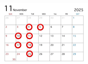 ⭕印が休業日です。11月も連休がありますので、ご予約等は早めをお勧めしております。