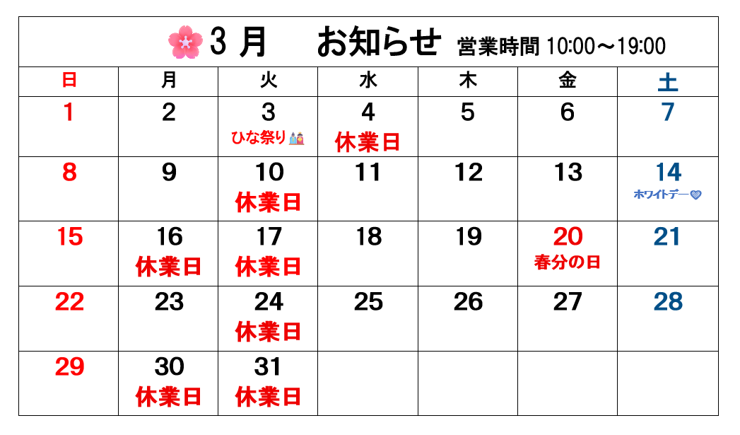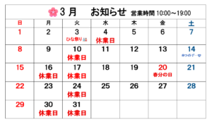 🎎3月のお知らせ🌸 md_user2026-02-14T14:52:09+09:002026/02/14|お知らせ| View Larger Image 3月3日(火)はひな祭りの為、営業いたします。翌日4日(水)が休業になります。 3月は休業日が不規則になり、また連休もございますので予約等は早めをお勧めしております。 営業時間は10時~19時です。 ご来店お待ちしております。